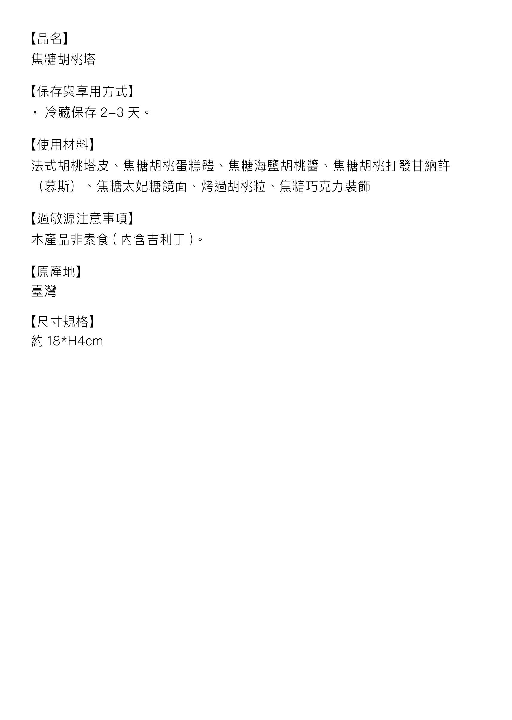 • 以焦糖與胡桃製成的濕潤蛋糕體和酥脆的法式胡桃塔皮讓整個甜點輕盈的同時更富有口感層次