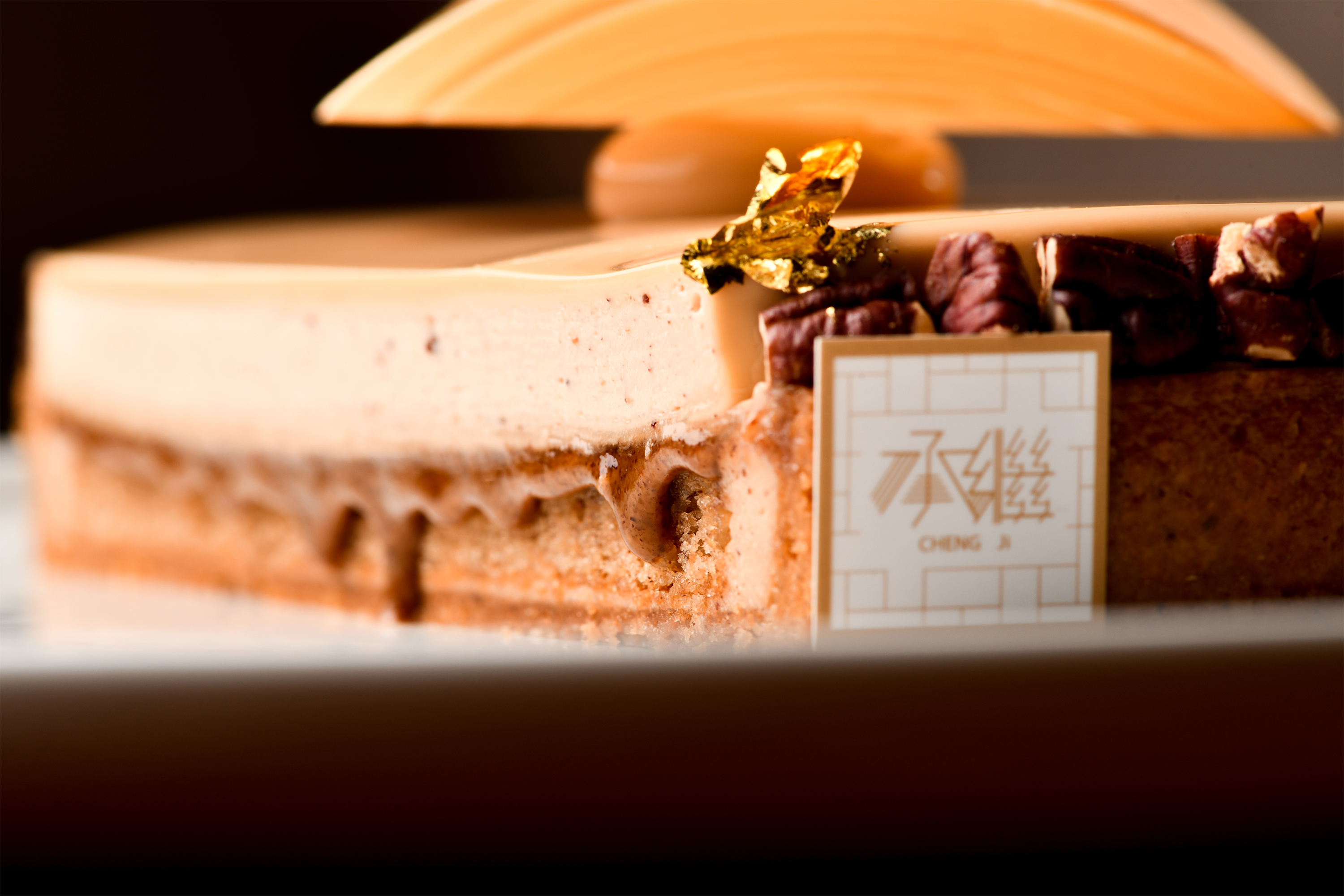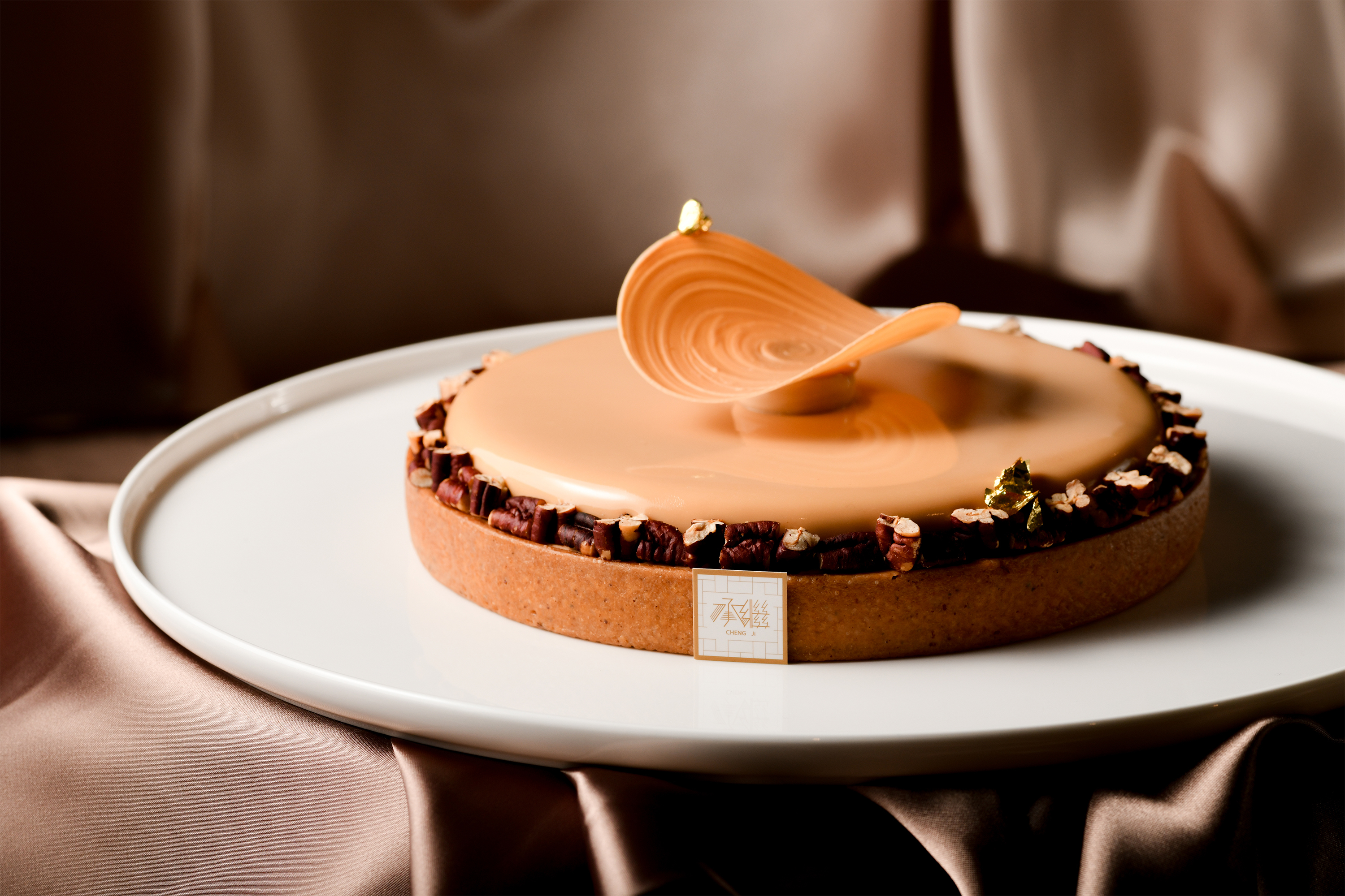 • 以兩種焦糖太妃糖製成的鏡面保持胡桃塔內部的濕潤外也帶來香甜的香氣
